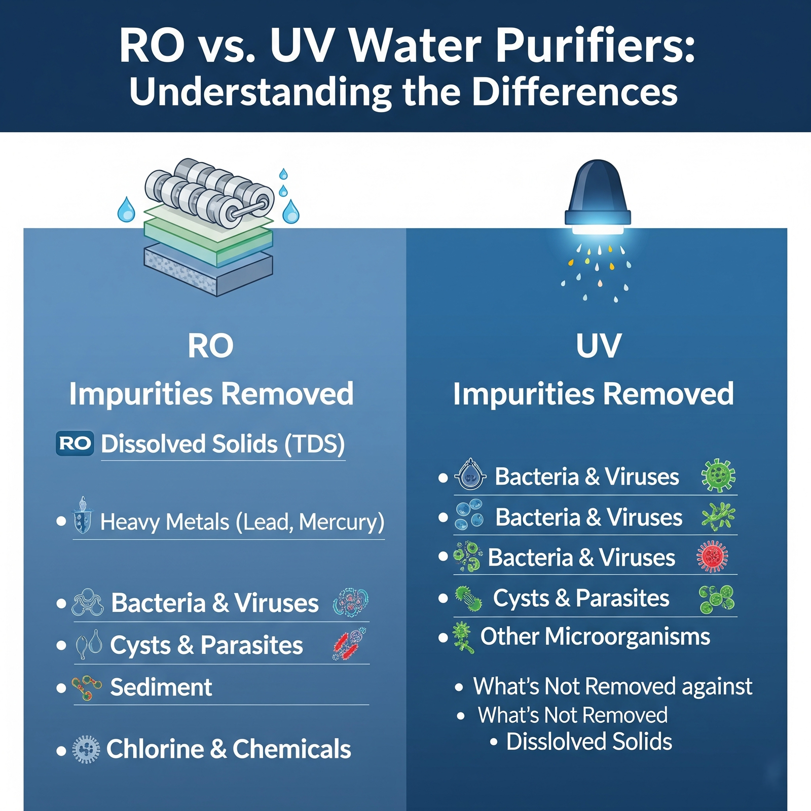 Choosing the right water purifier is one of the most important decisions for your family’s health. Two of the most popular technologies are RO (Reverse Osmosis) and UV (Ultraviolet). But which one is truly better? The answer depends entirely on the quality of the water you receive at home.