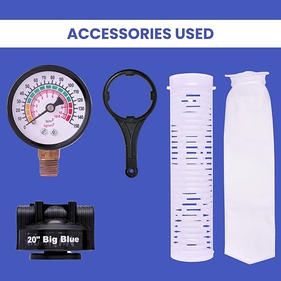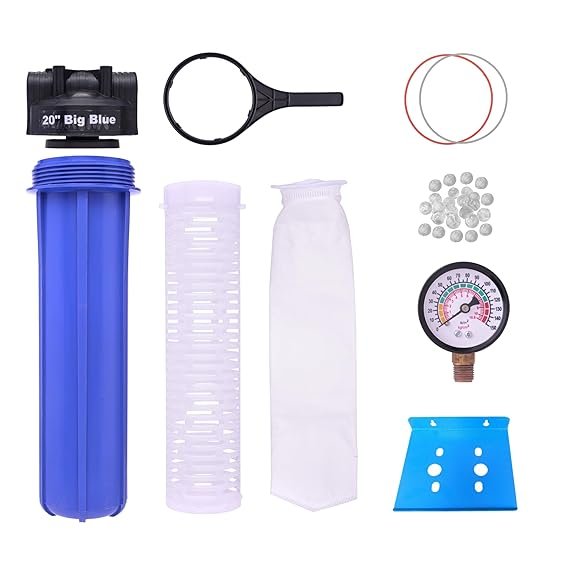 - Bag Filter 20-inch, 5-micron whole house water filtration system for water tanks. It includes a mounting plate, 20 Antiscalant balls, spanner, and pressure meter, ensuring clean water throughout your home.