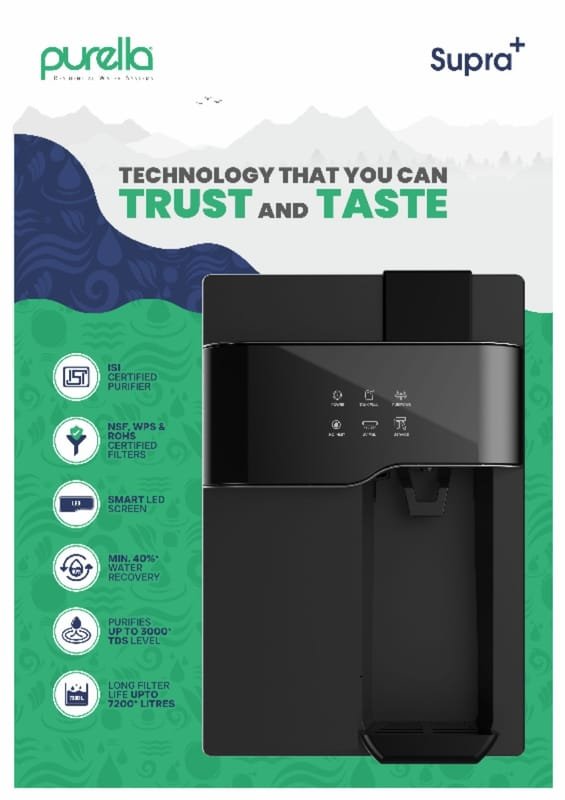 Certified by ISI, with NSF, WPS, and ROHS certified Filters, it guarantees the highest standards inwaterpurification technology. With a remarkable Minimum 40% water recovery rate and an impressivefilter life of up to 7200 Liters. Purella Supra+ works up to 3000 TDS. Promising sustainability andreliability.