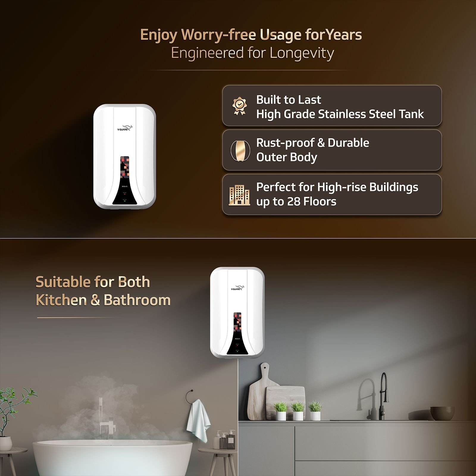 Efficient Compact Heating Featuring ample capacity, the V-GUARD Maha 5-Litre Geyser delivers a reliable supply of warm water, rightly suited for quick kitchen tasks or light bathroom use. So, whether you are rinsing dishes or filling containers, hot water is available whenever required. Clear Status Indicators Fitted with user-friendly LED indicators, this geyser clearly displays its power and heating status at a glance. So, even during busy household activities, a simple glance lets you know when the water is ready. Plus, the inlet and outlet valves also ensure smooth water flow and facilitate easy maintenance. Energy-Saving Control Incorporating a thermostat-controlled system, this geyser operates efficiently by switching off power once the desired temperature is reached. For example, during morning routines with multiple users, it heats only the necessary amount and stops automatically, helping to conserve electricity. Durable Stainless Tank Constructed with a high-quality stainless steel inner tank, this geyser offers long-lasting durability under frequent use. Additionally, its resistance to rust and scaling ensures reliable performance, even with varying water quality, including hard water. Consequently, it provides consistent heating and dependable service in diverse conditions. Ideal Kitchen Fit With its compact design, the V-GUARD geyser is suitable for under-sink installation or wall mounting in kitchens. Furthermore, delivering near-instant hot water, it streamlines everyday tasks such as washing vegetables, cleaning oily utensils, or heating water for cooking. Thus, this makes it a practical and time-saving addition to any busy kitchen.